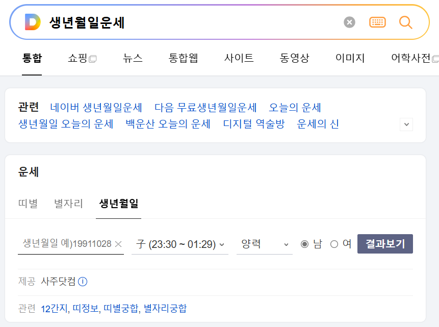 다음 포털 검색창에 '생년월일운세'를 검색하면 생년월일과 태어난 시와 음력 또는 양력, 성별을 입력 후 결과보기를 누르면 운세의 결과를 볼 수 있습니다. 결과는 오늘, 내일, 이달, 신년 이렇게 네 가지를 볼 수 있습니다. 사주닷컴을 기반으로 하고 있으며 오늘 운세의 결과에는 명언으로 운세의 마지막을 장식해주는 부분이 있습니다.