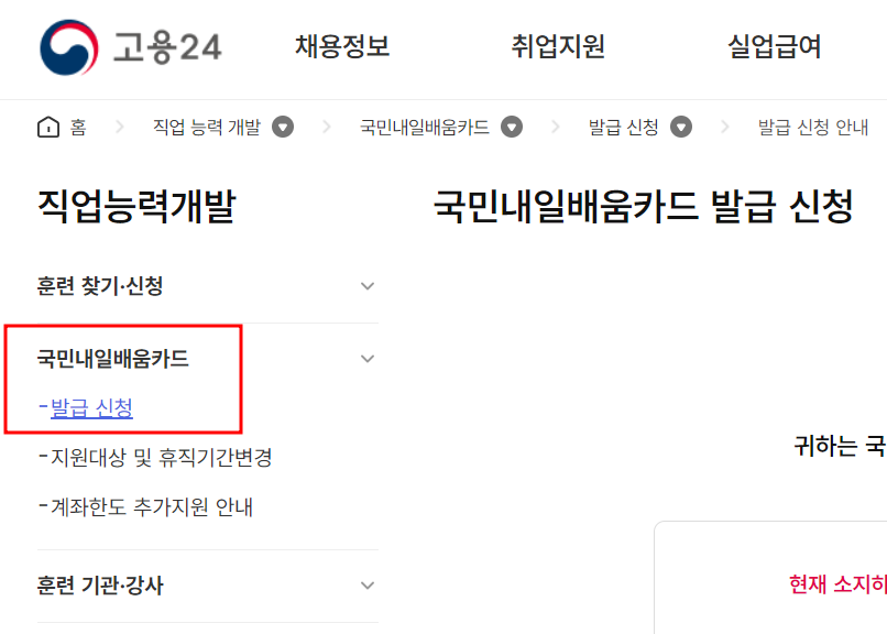 - https://www.work24.go.kr/ 고용24 홈페이지를 접속해, 로그인 후, 직업 능력 개발에서 국민내일배움카드를 신청하시면 됩니다.