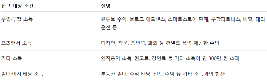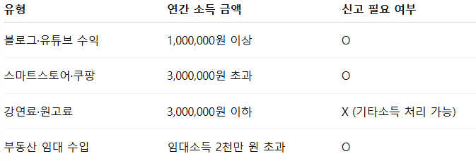직장인이라 하더라도 위와 같은 기타 소득이 연간 300만 원을 초과하면 종합소득세 신고 대상이 되며, 누락 시 가산세 등의 불이익이 발생할 수 있습니다.