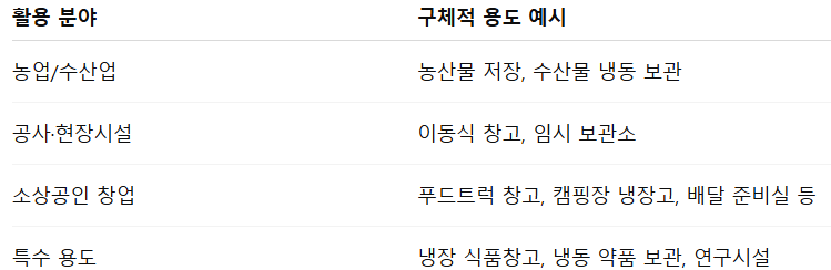 - 용도: 식품 보관, 수산물 창고, 간이 창고, 농산물 저장고, 창업 공간 등