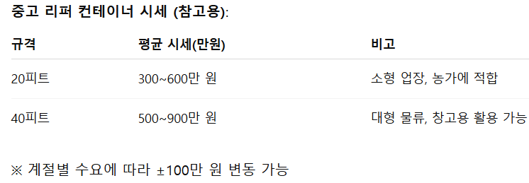 또한 컨테이너의 제작 연도, 외부 부식 상태, 내부 단열 상태 등도 중요한 판단 기준이 됩니다. 평균적으로 20피트 리퍼 컨테이너는 300만 원에서 600만 원 사이, 40피트 제품은 500만 원에서 900만 원까지 형성되어 있습니다. 다만, 수요가 집중되는 계절에는 가격이 상승할 수 있습니다.