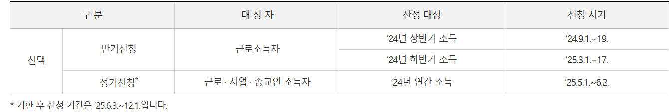 근로장려금은 근로소득이 있는 자는 반기신청과 정기신청을 선택하여 신청할 수 있으며, 사업 또는 종교인 소득이 있는 자는 정기신청을 하셔야 합니다.