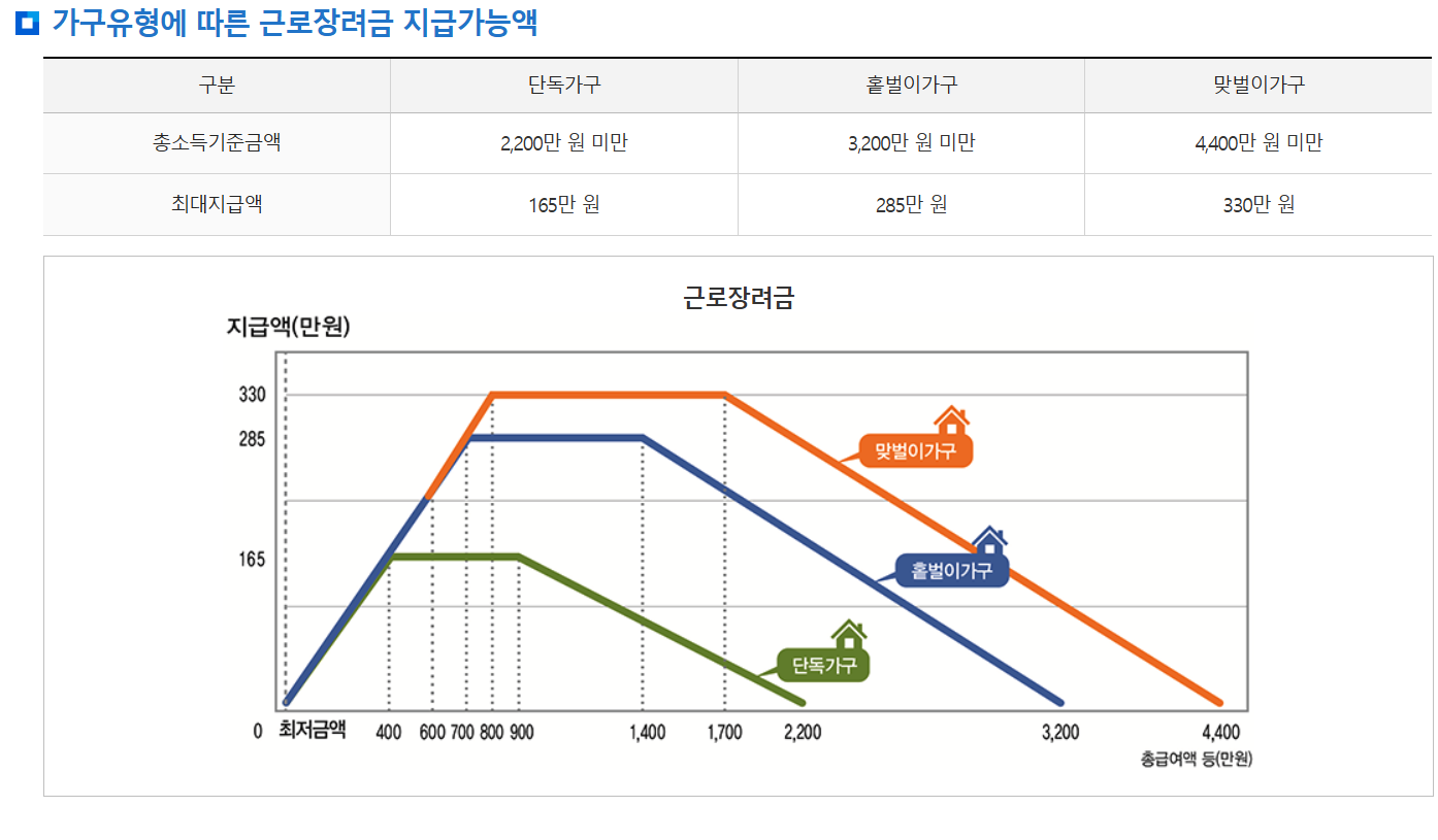 - 홑벌이 가구: 3,200만 원 미만 -> 최대 지급액 285만원
