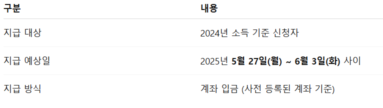 | 지급일이 정확히 언제인가요? | 보통 5월 말~6월 초, 5월 27일 전후 예상됩니다. |