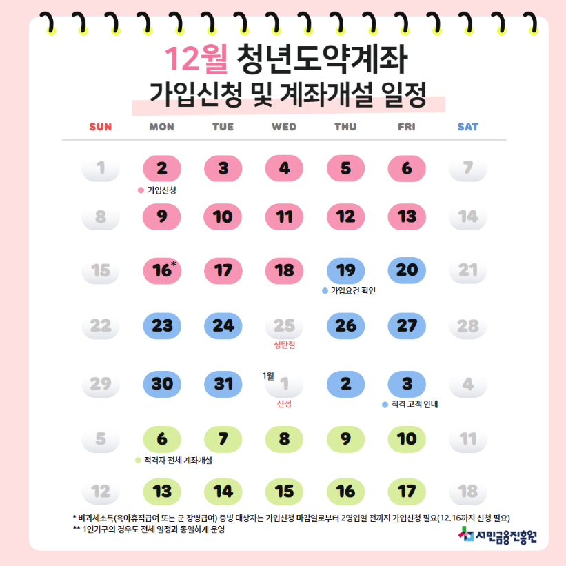 신청처 : 청년도약계좌는 11개의 협약은행에서 신청을 받고 있으며, 앱(KB국민, 신한, 우리, 하나, IBK기업, NH농협, 부산, 광주, 전북, 경남, iM뱅크)에서 비대면으로 신청가능하니 참고하시면 됩니다.